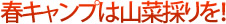 | 今年の桜は少々遅かったですが、しっかり“春本番”になりましたね。この時期から初夏にかけてのキャンプは、山菜採りがオススメです。山菜採りをして、キャンプや家庭で自然の風味をたっぷり楽しもう! |