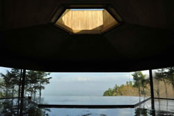 扉を開けると、そこにはまた、パノラマを演出するための大きなガラスと六角形の天窓が。 弱アルカリ性の軟水を地下からくみ上げて湧かしているというお湯は、もはや温泉そのものと言っていい。 天然水のお風呂を堪能しながら、日光のリゾートの底力に嘆息するほかはなかった。 |