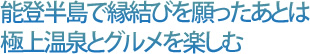 | 縁結びにご利益のある神様にお願したい。どうせ神社に行くなら、素敵な旅行にしたい。旅先は「おいしさ」優先で選びたい。夏休みや秋の旅行シーズンにどこに行こうか迷ったなら、縁結びの神様にも、グルメの神様にも祝福された場所、能登半島に出掛けましょう! |