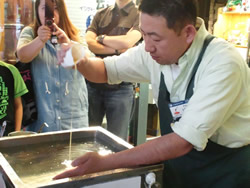 職人さんが紙コップで薄い黄色のロウをたらして天ぷらの衣を作る