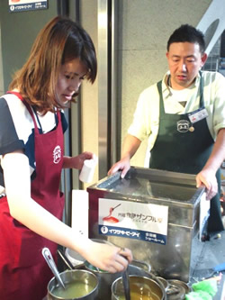 緑色のロウをお玉ですくって、お湯のなかにとろーり。それをゆらゆらゆらし、お湯から出して、くるくるっと巻く。あっという間にレタスの出来上がり。 包丁で真ん中を切ると、切れ目までレタスと同じ!なんてすごいんだろう! 要領を覚えてから、体験希望者が天ぷら作りに挑戦する。 職人さんから差し出されたカゴの上には海老、イカ、カボチャなどの食品サンプル。天ぷらの具です。これらに天ぷらの衣をつけて完成だ。 いちばん人気は海老とのこと。 体験希望者は衣になるロウを紙コップからジョボジョボっとお湯に入れて、衣の感じを出す(なんだか、ゆらゆらとか、くるくるとか、ジョボジョボなどの雰囲気言葉が多いですね。でも、その表現がいちばん合ってるんです)。 お湯の中で広がった衣で、海老をくるんでいけば、あーら不思議、まんま海老天の出来上がりとなる。
