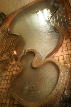 ![]() 正保4年(1647)に記された『出羽一国絵図』には、川井のうち湯台村との表記がある。古くは湯ノ台(湯の岱)と称され、山間部のいたるところで湯が自然湧出していたと伝えられる。江戸時代には佐竹藩公認の休養地だった。明治29年(1896)に、初代押切永吉によって湯治宿が建立された。この一帯は白狐の住む里として知られ、信仰心の篤い押切永吉は敷地内に稲荷神社を迎え、商売繁盛の神として湯治客から参拝されていたという。のちに館名を「稲荷住む土地」という意味の「稲住温泉」と改めた。写真は内湯の「ひょうたん風呂」