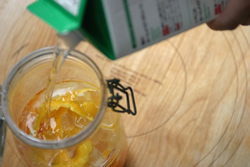 ここでは、短期間でできる果実酒を紹介しよう。 ゆず酒 [材料] ゆず3個、レモン2個、氷砂糖100g、ホワイトリカー900? [造り方] 1、ゆずは皮をむき二つ割りにする。レモンは皮をむき、適当に輪切りにする。 2、ゆず、ゆずの皮1個分、レモン、氷砂糖を保存瓶に入れ、ホワイトリカーを入れる。 3、10日後に皮を出す。ゆずとレモンは1カ月後に取り出す。熟成には2カ月かかるが、1カ月後でもおいしく飲める。 ![]() ネーブル酒はわずかにオレンジ色で美しい