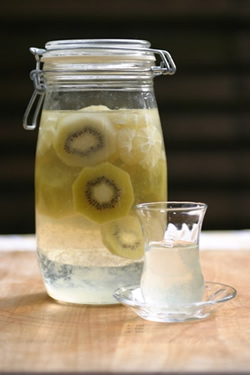 [材料] オレンジ(ネーブル)500g、氷砂糖200g、ホワイトリカー900? [造り方] 1、オレンジはよく洗って、1cmぐらいの輪切りにする。へそとおしりは取り除く。 2、オレンジ、氷砂糖とホワイトリカーを保存瓶に入れる。 3、1カ月後にオレンジを取り出す。飲みごろです! ![]() キウイ酒はなかなかに美味