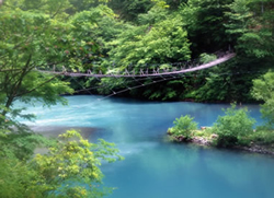 所在地:静岡県榛原郡川根本町寸又峡温泉 TEL:0547-59-3985 泉質:アルカリ性単純硫黄泉 泉温:43度 営業時間:10:00~19:30 入浴料:大人400円 定休日:木曜日 金谷駅はJR東海道線金谷駅との乗り換え駅だが、駐車場はない。 クルマで行くときには、東名高速道・相良牧之原ICより北へ20分ほど北上したところにある新金谷駅へ向かう。駅には有料駐車場があり、駐車料金は1日700円。クルマを置いて蒸気機関車に乗り換えるか、それとも車窓から機関車を眺めて上流へ向かうか、悩ましい選択を迫られる。 ちなみに午前中に1日1本(繁忙期は3本に増便)運行される蒸気機関車に乗るには座席予約が必要だ。 大井川は中流域が大きく蛇行しているが、線路はそれを縫うように遡上していく。 ダムによる水力発電のため、川幅に比べ水量は少ない。 それが残念と言えば残念だが、河岸の町と山野の合間を力強く進んでいく蒸気機関車に乗っていると、タイムスリップしたかのような感覚に襲われる。 1時間20分の旅はまったく飽きることがない。 すれ違う駅で見かける列車や、車内の設備のひとつひとつがレトロで、つい目を奪われてしまう。 当たり前だが、機関室では本当に石炭をくべている。 「SLおじさん」「SLおばさん」と呼ばれる車掌が客席にまでやってきて、ハーモニカで演奏をはじめたのには驚いた。 こういった演出も含めての運賃と考えると、遊園地の乗り物とは比べ物にならないくらいの満足感がある。 終点の千頭駅からは、バスに乗り換え、40分かけて支流の寸又川沿いの林道を上がっていく。 最終目的地は山の奥深いところにある寸又峡温泉。 芸者やコンパニオンは置かない。ネオンサインはつけない。山への立て看板は設置しないという三原則を頑なに守り、「日本一清楚な温泉保養地」をめざしている静かな温泉地だ。 寸又峡温泉から先は一般車の車両は進入禁止だ。 ダム湖にかけられた「夢の吊り橋」を見るため、徒歩で約90分の「寸又峡プロムナードコース」散策に出かけてみる。 トンネルを歩き、林に囲まれた林道を抜けると、突然エメラルドグリーンの湖が見えてきた。 ![]() 幻想的な「夢の吊り橋」。途中から引き返す人がいるほどだ