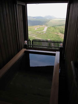 山頂に向かう途中で寝床を確保するには、自分でテントを担いでいくしかなく、山小屋を利用するのはごくまれなケースだ。 そこにはもちろんお風呂はなく、ベッドや布団すらないこともある。 雨や夜露をしのげればいい。それが当たり前だと思っていた。 ところが上高地の宿事情を知った時に、食事のメニューがあると聞いてかなり驚いた。食事だけではなく、風呂まであるという。 蔵王のようなスキー場としても有名な観光地であれば、山の懐に温泉街が形成されているのは知っている。 しかし、頂上をめざす登山道の中継地点や山頂付近に宿泊施設があるとなると話は別だ。 上高地の河童橋付近には数軒ものリゾートホテルがあり、さらにそこから数時間も歩いた山道の途中に、風呂のある山荘があるとは想像すらできなかった。 自分のような既成概念をもつほうがマイノリティなのかもしれない。 井の中の蛙は、自分の経験した範囲でしか物事を考えられないのだと、思い知らされたものだ。 あれからもうしばらく経つが、本格的な登山にチャレンジすることもなくなり、こうした山小屋のことはすっかり忘れてしまっていた。 最近のことだが、ちょっとしたきっかけで、長野県の美ヶ原高原に雲上の宿があることを知った。 写真からでは周囲の自然環境とホテルの施設とのイメージがつながらず、足を運んでみることにした。 ![]() 家族用の貸切風呂。展望風呂や露天風呂からはもっと壮大な光景が広がる