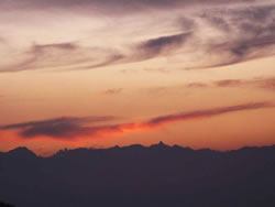![]() 西に松本市、南には諏訪湖があり、北東に行けば上田市に出る。 この地にある施設で有名なのは、美ヶ原高原美術館かもしれない。 フジサンケイグループの財団法人彫刻の森美術館が、箱根の姉妹館として運営しているため、よくCMスポットなどで宣伝が流れている。 この一帯は八ヶ岳中信高原国定公園のため、山頂の王ヶ頭(2034m)付近にはマイカーでの乗り入れが規制されている。 雲上の宿の「王ヶ頭ホテル」は、まさにこの山頂にある。 ひとつめのルートは、中央自動車道・岡谷ICから東側の入口となる山本小屋駐車場をめざすことになる。国道142号を北上し、和田峠からビーナスラインを走る爽快なルートで、約60分で駐車場に着く。 もうひとつが長野自動車道・松本ICから西側入口の美ヶ原駐車場(美ヶ原自然保護センター)をめざすルートだ。国道254号から美鈴湖を通り、美ヶ原スカイラインを上っていく、約80分の行程だ。 さらにもうひとつ、上信越自動車道・東部湯の丸ICから山本小屋駐車場をめざすルートもある。国道152号から県道62号、美ヶ原高原美術館をたどり、約90分のドライブになる。 駐車場は標高約1900mで、ほぼ山頂付近までクルマで上がってくることができる。 駐車場からホテルまでは歩いていくか、ホテルの送迎バスがあるのでそちらを利用すればいい。 美ヶ原は深田久弥の『日本百名山』のひとつに数えられているが、クルマでもっとも 手軽に行ける山なのだ。 この日は東京で35度を超える猛暑日だった。避暑地であるはずの軽井沢でも気温は30度近くまで上がった。 雲上のホテルの標高は約2000m。 ドライブの途中から、クルマのエアコンを切り窓を開けると、気持ちいい涼しい空気が車内に入ってきた。 美ヶ原は広大な台地といっていいかもしれない。 地形は平坦で、あたりは放牧地になっており、牛がのんびりと草を食んでいる。 視界をさえぎる樹木がないために、周囲の山々を、360度見事に見渡すことができる。 この地形を活かしたのが、ホテルの背後にある電波塔だ。 かつては地上アナログ放送対応だったが、長野県を対象とする地デジ放送の電波塔が林立している。 それにしても、山並みの美しさはすごい。 北は妙高山や白馬の山々、南は八ヶ岳や遠くは富士山まで、西は槍ヶ岳を中心とする北アルプス連峰、東は浅間山や草津白根山、秩父連峰。 これほど遠方の、しかもすべての方位を望むことができる絶景スポットがあるとは知らなかった。 秋になると、たくさんのアマチュアカメラマンがこの地を訪れるようになる。 紅葉はもちろんだが、雲が低くなり、幻想的な雲海が眼下に広がるのだ。 雲の合間から顔をのぞかせる日本の尾根の峰々の頂は、この世のものとは思えない荘厳さを感じさせる。 ![]() 西の夕日の方向にはひと際突き出た槍ヶ岳(3180m)が見える