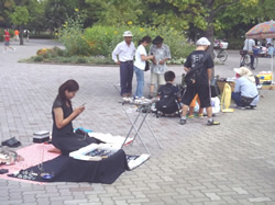 ベビーカステラやチョコバナナがあると、ちょっとホッとするのは僕たちの年代の人なら同様だろう。 子どものころも、大人になった今も、縁日に並ぶ屋台はいつもウキウキした気分にさせてくれる。 数年前、木場公園でフリーマーケットが開催されると知って訪ねてみた。 それぞれの小さなスペースで、衣類や本、CDなどを並べる人たち。 これも一種の縁日である。僕はウキウキした気分で、会場を散策した。 |