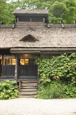 ![]() 本陣に連なる調理室。6年に1度茅葺の屋根が葺き替えられる