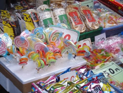 ![]() 「時の鐘」の前を過ぎる人力車。今日でも時を告げる鐘が鳴る ![]() 色とりどりの駄菓子が並べられた菓子屋横丁のお店