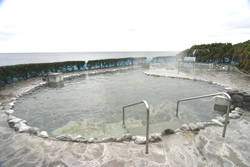 三原山を望む雄大な露天風呂と 源泉かけ流しの湯でくつろげる 所在地:東京都大島町泉津字木積場3-5 大島温泉ホテル 泉質:単純温泉 源泉:69度以上 湧出量:毎分188リットル 入浴料:大人800円/小人400円 営業時間:6時~9時/13時~21時 TEL:04992-2-1673 ![]() 元町浜の湯