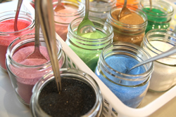 ![]() テーブルの上に置かれたカラーサンドは15色あります