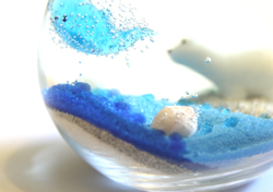「イルカは空中に浮かべてください」とお願いすれば、谷澤さんがホットプレートで温めたクリアキャンドルを注ぎ、イルカを指定の位置に置いてくれる。 こうして、自作の小さな「北極おとぎの国」がカップ内にできあがった。 キャンドルが固まるまで約1時間の待ち時間はあるが、とても楽しいひとときだった。 ちなみに、クリアキャンドルもロウソクである。ヒモを入れることによって、ロウソクとしての使用もできるが、とても火を灯す気にはなれない。 当分はリビングルームの飾りにするつもりだ。 |
