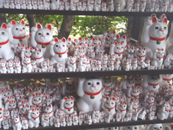 駅のそばに駐車場は少ないのですが、探してみればコイン式パーキングも点在しています。 電車で行っても、クルマでおでかけしても振り出しは豪徳寺駅。駅前に招き猫像がありました。ただし、白い部分がやや汚れています。 豪徳寺までは駅から徒歩10分。商店街を抜けると、閑静な住宅地に豪徳寺があります。 ちなみに商店街の名前は「たまにゃん通り商店街」!! なんだか、ひこにゃんと元祖争いをしている風な印象を抱きます(笑)。 ひこにゃんと大きく違うのはたまにゃんグッズをほとんど見かけないこと。ベーカリーにたまにゃんのサブレーがありましたが…。 広大な境内をもつ豪徳寺には井伊直孝をはじめ井伊家のお墓があります。 いろいろ見ていくと招き猫ゆかりの寺であるのがわかります。絵馬にも招き猫、御守りなどにも招き猫。 しかし、飲食店などで見かける招き猫とはどうも違います。 理由がわかりました。一般の招き猫は右手を挙げている猫は金運を招き、左手を挙げている猫は人を招くとされています。 我が家の招き猫も右手を挙げている猫には「億万両」と描かれ、左手を挙げている猫には「招福開運」とあります。 ところが、豪徳寺のものは、すべて右手を挙げており、小判を持っていないのです。 井伊家の菩提寺だけに、武士にとって左手は不浄の手であり、「招き猫は機会を与えてくれるが、小判が付いてくるわけではない」という説のためだそうです。 |