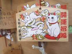 ![]() 境内には「招猫堂」があり、その横にはご利益をもたらせた多くの招き猫が奉納されている ![]() 絵馬にも招き猫が描かれています。豪徳寺は東京都台東区の今戸神社と並んで招き猫発祥の地と伝わっています