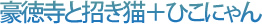 彦根というか滋賀県を旅すると、おみやげ売り場にはひこにゃんが入ったお菓子やグッズがものすごく多いのに気付きます。ひこにゃんは彦根と滋賀県に経済効果ももたらした、偉大なるキャラクターなのです。 ところで、ひこにゃん誕生の秘密をご存じですか? 彦根といえば井伊蕃。二代藩主の井伊直孝が江戸にいたときのこと。鷹狩りに出かけた直孝はある寺の前で“手招きする猫”に誘われて境内に入り、住職からお茶の接待を受けていると、直後に暗雲が広がって雷雨になりました。 にっこり笑ったのは直孝です。 「これは縁起がいい。猫が招いてくれなかったら、ずぶ濡れになっていた」と喜んだ直孝は、そのお寺を井伊家の菩提寺にしました。 直孝没後はその院号にちなみ、そのお寺は豪徳寺と名を変えたのでした。 この件以来、東京・世田谷にある豪徳寺では「招福猫児(まねぎねこ)」と称して祀っています。 また、井伊家ゆかりの彦根市では招き猫に井伊家のシンボルである赤揃え(武具を朱塗りにした部隊編成)の兜をかぶらせて「ひこにゃん」が生まれたのです。 |