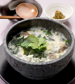 ![]() あっさり塩味と牛テールがみごとにマッチ、絶妙な味わいを演出している雑炊です。容器に“石鍋”を用いたのも絶賛すべき点で、最後のひとくちまで熱くいただけます。 |