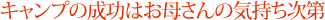 キャンプが好きになり、エンジョイしているご家族の特徴ははっきりしています。 ☆ 「働き者のご主人がいること」です。 ☆ キャンプ場では奥さまの代わりに食事を作る。奥さんには自然の中で日常を離れてのんびりしてもらう――この意識がはっきりしているご家族はキャンプが成功します。 また、害虫対策などもご主人が気を使ってあげる。 奥さまも自然を十分に楽しみ、ご主人のやさしさを再認識して、「また来よう!」となるわけです。 反対にキャンプ場でも奥さまに調理をさせ、本人は子どもと一緒に「遊びの天才」なんていって遊びまわっているご主人の家族はダメですね。奥さまにしてみれば、何がおもしろいかわからない。 そういうご家族はキャンプ場イベントでお会いしても、再会することはありませんでした(笑)。 Q おしまいのひとことを