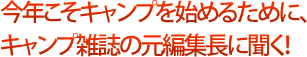 | お出かけマガジンの読者ならSmart Accessの特別編集『初めての方でも大丈夫! オートキャンプ特集』をすでにお読みのはず。それでも、まだキャンプ経験がない人のために、キャンプ&キャンピングカー雑誌『ガルヴィ』の元編集長にキャンプのすすめを聞きました。 |