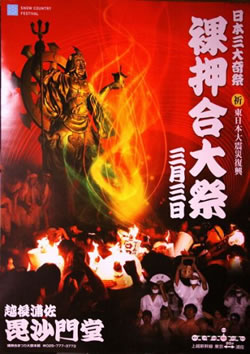 おかげで大晦日は地元の銘酒・八海山をいただき、温泉に何回も入って、すっかりいい気分になりました。 年が明けると日本人は不思議、「初詣でに行きたい!」欲求がむらむらと湧き上がってきます。 旅館の女将に名所を尋ねれば、クルマで少し走れば「毘沙門さま」がある、と。 毘沙門堂があるお寺の正式名称は吉祥山普光寺。創建は鎌倉幕府のころと伝わります。 毘沙門堂はその名のとおり、七福神のひとり毘沙門天を祀る場所です。浦佐だけでなく、京都や花巻をはじめ全国に点在しているのは五穀豊穣、家内安全、身体健康にご利益があるためです。 それらのなかで浦佐の毘沙門さまが全国的に知られるのは、3月3日に開催される「裸押合い大祭」があるからでしょう。日本三大奇祭(三大奇祭とポスターに謳われているんですが、あとのふたつは長野・諏訪の御柱祭、秋田・男鹿のなまはげ、山梨・富士吉田の吉田の火祭りなど諸説あって…)として広く告知されています。 2日の前夜祭では「大護摩修行」、「大ロウソク耐火式」、「福餅撒与」などが行われ、当日は午前中から行事がぎっしり。クライマックスは夜になってからで、数回の「水行(押合い)」や「大鏡餅撒与」が行われます。 |