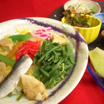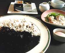 ![]() 「うわっ!」と驚く真黒なカレーです。十八穀米に合わせたイカスミがその秘密。付け合わせは名古屋コーチンの温泉玉子。玉子を混ぜればぐっとマイルドに。薬味も特産の「菊いも」、「山ごぼう」を用意。地元づくしの変わり種カレーです。 |