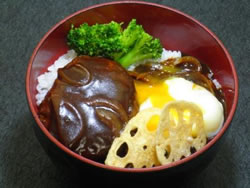 ![]() 別に熊の丼ではありません。かつて南条のある「今庄駅」はSLが止まり賑わっていました。そのころ、列車の乗務員のまかない飯として出されたのが八熊丼。現在ではロコモコ風になっています。 |