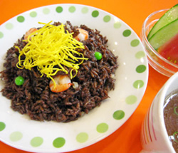 ![]() つい最近、岡山に取材に行った編集部員が食べてきました。名物の小エビが入った黒色のピラフです。キャラメルソースが使用されていて、独特な味がなんともいえません。ぜひ、食べてみて。 |