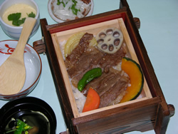 ![]() 横川といえば釜飯ですが、寒い時期には熱々のせいろご飯がたまりません。せいろの上には焼きたての地産牛である上州牛のサーロインがのっています。これはおいしそう! |