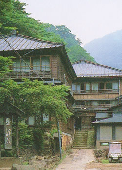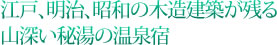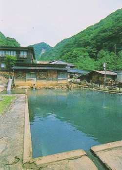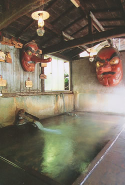北温泉旅館 所在地:栃木県那須郡那須町湯元151 泉質:単純泉、弱食塩泉、鉄泉 源泉:56度/50.8度/49.6度 入浴料:大人700円/小人400円 日帰り入浴営業時間:8時~16時 TEL:0287-76-2008 今回向かう温泉は、秘湯中の秘湯として人気の高い、北温泉旅館だ。 温泉好きである、かの、つげ義春お気に入りの温泉宿ということからも、にやりとする読者もいるかもしれない。 いまとなってはつげ義春についての説明が多少必要だろう。 1970年代から80年代にかけて、田中角栄がぶちあげた『日本列島改造論』(72年)に象徴されるように、世の中は高度経済成長の真っただ中にあった。その片隅で好景気の波に乗れぬまま、発展から置き去りにされていく人たちもいた。 「ゲゲゲの鬼太郎」を生んだ水木しげるのアシスタントだったつげは、ペン画による独自の作風でイラストや漫画を描いていく。 描かれるのは旅行先の風景や人々、自分の日常の姿や、シュールな夢だ。 急成長する時代から置き去りにされていく地方文化や人々の暮らしを、ニヒリズムを漂わせながら、シニカルに描いている。 明るいテーマとはいえないにもかかわらず悲劇的にならないのは、ときおりユーモアややさしさが垣間見えるからだろうか。 自らの不遇な視点からの共感が作品に温かみを添えていて、だからこそ時代を超えて、読む人の心に訴えかけてくるのだろう。 さて、北温泉については、つげは77年に漫画ではなくイラストを描いている。 温泉宿へと続く道を歩いていく自分の後ろ姿と、夜の露天温泉プールにひとりぽつんと浸っているシルエット。いずれも写真で瞬間を切り取ったかのようなひとコマだ。 つげがイラストを描いてからすでに35年が経過し、昭和が終わってもう20年以上 にもなる。 あれから宿はどのように変化を遂げているのか。 正直なところ、なにもかもがすっかり変わってしまった平成の世に、“昭和的なほの暗さ”が残っているとはとても思えなかった。 東北自動車道・那須ICを出て那須街道を北に向かう。 約20分ほどで那須湯本温泉街を通過。鳥居を左手に見ながらさらに上っていく。 ここから上は那須高原道路、ボルケーノハイウェイだ。 標識にしたがって那須岳のほうに左折、しばらく行くと北温泉旅館の看板が見えてきた。ここからは約1kmで着く。 だが少し走ると、クルマでは宿へ近づけなくなった。ここへ駐車して、宿へは400mほどの遊歩道を下っていかなければならない。 クルマ1台が通るのが精一杯の整備された道を下っていくと、山の懐に温泉宿が見えてきた。 そして傍らには、まるで池のような温泉プールから、湯気が立ち上っている。 まさに、つげ義春が描いたままの風景がそこにあった。 風情のある木造3階建ての建物。 昭和13年(1938)に起きた福島県東方沖地震の当時、北温泉旅館は100室を超える大温泉宿だった。しかし、大地震により建物はことごとく倒壊し、かろうじて難を逃れた2棟が現在も残っている。 ひとつは安政5年(1858)建立、そしてもうひとつが明治18年(1885)という年季ものだ。 昭和になってからもうひと棟が建てられ、古い時代のものほど、宿泊料金が安く設定されている。 この地に温泉が発見されたのは、修験道の道場として、天狗と呼ばれた山伏が那須山で修行をしていた頃のことだ。 宝亀年間(770~780)に、大天狗が日光山より出羽国へ行く途中に発見したと伝えられている。 天狗が大石を投げ飛ばしたところ、湯がこんこんと湧き出るようになり、その大石は現在も残っている。 北温泉で湯宿が開業するのは江戸時代になってからだ。 元々は、この一帯を統治する黒羽藩大関家が治めていた。下野国那須郡に存在した中世以来の豪族で、現在の大田原市に陣屋を置いていた。 明治時代に、初代熊谷源三が温泉守となり、「岐多温泉」、「喜多湯」として世に知られるようになる。 明治19年に編纂された『日本鑛泉史』には「岐多温泉」の表記はない。 栃木県那須郡湯本村字北湯の住所表記に登場するのは「相ノ湯鑛泉」だ。 「位置景況」の説明書きに“この温泉を「瀧の湯」、「天狗の湯」などと唱える者あり”という表記があるのだが、じつはこれらの名称は、現在の北温泉の湯船の名として継承されている。 ![]() 「天狗の湯」の壁には巨大な天狗の面が。ランプの明かりがさらに風情をかきたてる
