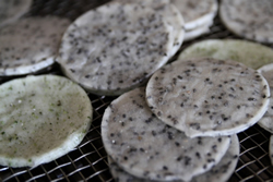![]() 「生地(きじ)」と呼ばれる焼かれる前のお煎餅。ゴマ入りや青のり入りも