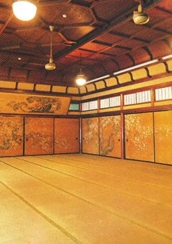 ![]() 大広間「神代閣」。神代杉や桜、桐など数種類の銘木を多用。仙田菱畝の花鳥図の襖絵が見事だ