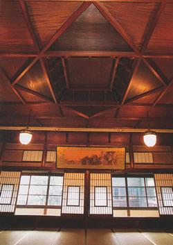 ![]() 舞台つきの大広間「万象閣」。壮大な折上天井に目をみはる