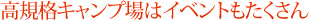 | 今年からキャンプを始める人も、すでに始めた人も、せっかくキャンプ場に行くのなら楽しいイベント日を狙ってみない? 同じようにイベント目当てにやってきた人とも友人になりやすく、アウトドアの新しい一歩が踏み出せるかも!? |