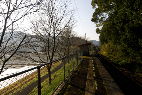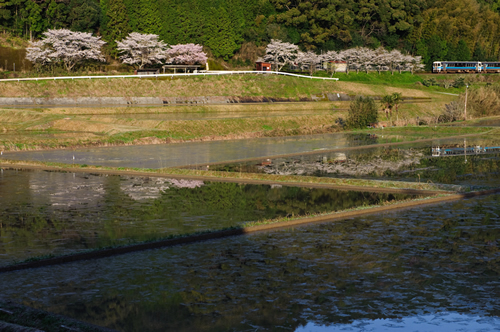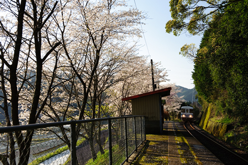 写真C、Dは高知県の土佐くろしお鉄道中村線・稲荷駅です。ここは、取材で四万十川を訪れた際に帰りの車内から見つけ、いつか春に訪ねてみたいと思った駅です。2007年に訪れたとき(写真C)は、残念ながら桜が咲いていませんでした(1週間ほど早かったようです)。そこで、2010年に再度訪ね、撮影したカットが写真Dです。写真CもDも同じ時間帯に撮影していますが、桜が咲いている写真Dのほうが鮮やかで華やいだ印象に見えます。