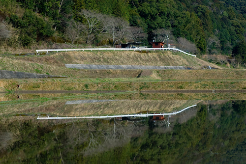 なお、この角度からでは駅の存在が分かりにくいので、とくに写真Fでは到着する列車を待って撮影しています。偶然ですが、写真Fを撮影した日は朝の気温が低くなり、手前の水田の水面が凍り、華やいだ中にも春の空気のひんやりとした雰囲気も写すことができました。