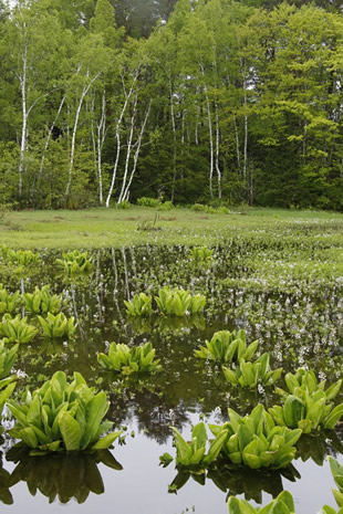 そこで、レンズをズームさせ、沼に映っている対岸のシラカバをアップで撮影したのが写真Bです。主題を絞ることで、水芭蕉の葉や白い花の存在も際立ち、より印象的な写真に仕上がりました。この方法を俗に「切り撮り」などと呼んでいます。