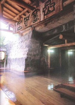 ![]() 名物「半天岩窟風呂」。温泉というより、巨大な岩の部屋。奥の岩肌から湯が注がれているのがなんとも神々しい