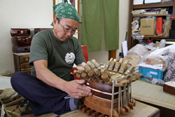 ところで竹中雛人形製作所、1月から4月のあいだは体験ができない。この時期、雛人形と五月人形の完成に追われ、とても手が放せないのだそうだ。 「三味線かとう」では三味線の皮張りや修理の様子が目の前で見られる。代表の加藤金治さんが目の前で道具や糸を使って巧みに皮を張る。 ![]() 「三味線かとう」では目の前で皮張り作業が見られる