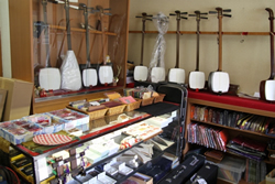 ![]() 店内には三味線や用具が並ぶ。