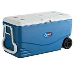 コールマン エクストリーム(R)ホイールクーラー/100QT お値段少々高めだけど、家族やグループで使うには絶対にほしい大容量のクーラーボックス。夏は飲み物を冷やしておくだけでなく、食材をきちんと冷蔵しておくのは基本中の基本。持ち運びに便利なホイールがついているのもポイントが高い。 上蓋を閉じれば簡易テーブルに早変わり。ただし、中をぎちぎちに詰め込んでクルマから出し入れするときは、ぎっくり腰に注意! |