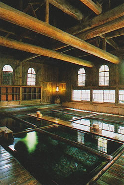 長野県秋山郷の切明温泉は川そのものが温泉で、初めて見る光景に度肝を抜かれた。 何組ものグループが、そこかしこに石囲いの浴槽を作って温泉を楽しんでいる。 川には水が流れているが、大地の底からお湯が湧いており、水の流れを少し調整すれば快適な湯温になるのだ。 温泉達人の故・野口悦男氏と行った秋田県の秋の宮温泉郷も印象深かった。 スコップを片手に川原に下り、川底を掘りはじめる。たちまち温かな湯が足をなでるように流れていく。 石で流れをせき止め、少し深めに掘ると、それだけ体全体がすっぽり入る天然の湯船ができる。 地元の人には「川原の湯っこ」と呼ばれ、川原の湯にひたりながらラーメンなど出前を頼めるサービスがあることには驚いた。 温泉天国。 まさに極楽とはこういうことだ。 竹下内閣のふるさと創生資金で地方にばらまかれた1億円を原資にして、全国の町や村には日帰り温泉施設が雨後の筍のようにできた。 いまでは、日本のどこに行っても温泉に入ることができる。 火山国であり、伏流水が山から海へと流れ込むこの国では、ボーリングで1000mも掘れば地下水が出てくる。温かければ温泉に、水温が低くても沸かせば天然温泉と名乗ることができる。 たとえどんなに深いところからくみ上げようとも、それはそれで温泉を楽しむことはできる。 だが、古くから温泉と親しみ、自然の恩恵を受けてきた温泉地には、どうやっても勝てないような気になってしまうのだ。 温かい湯が自然に湧いて出ているような温泉地を訪ねると、その土地や住む人々から、独特な、余裕ある雰囲気を感じることがある。 それは、近年になって登場したボーリング温泉にはない雰囲気だ。 「内湯」について、考えを改めるきっかけになったのも、こうした自噴の温泉に出会う機会が増えたことが大きい。 それまで、温泉の醍醐味は露天風呂にあると思い込んでいた。 だが、古くからある温泉宿の老朽化した建物の中に、原石のような「内湯」がひっそりと残っているのを“発見”したとき、温泉本来の姿がここにあることに気づかされたのだ。 それらの内湯は「自噴する湯船」だった。 浴槽の尻の下から、または岩の隙間から、自然に湯が湧き出している。 順序は逆で、自然に温泉が湧出するところに湯船を作り、雨が当たらないように屋根で覆い、のちにそれが浴室になったということだ。 だから、その湯船には歴史がある。 川の流れをせき止めてつくる野天風呂と同じ、フレッシュな天然そのものの温泉の原点が「0m温泉」、すなわち自噴する湯船にあるのだ。 今回取り上げる温泉も、湯船の底から自噴する「0m温泉」で有名な宿だ。 かつて、国鉄(現JR)のフルムーンキャンペーンで、上原謙と高峰三枝子がふたりで入浴した温泉といえばピンとくる方もいるだろうか。 群馬県にある、法師温泉長寿館だ。 長寿館は、国道17号線を沼田から苗場スキー場へと向かい、県境の三国峠を越える手前の沢沿いにある。 『日本鉱泉誌』(内務省衛生局編纂)によると、発見は元禄12年(1699)。 明治9年(1876)~13年(1880)までの年間平均来場者数は1727人とあり、交通の不便なところでありながら、北越方面にその名はよく知られていたようで、人気ぶりがうかがえる。 長寿館は明治5年(1872)に初代岡村貢(おかむらみつぎ)が創業した。新潟県南魚沼市の大庄屋に生まれ、南魚沼郡の初代郡長を務めた。 東京―新潟間を結ぶ上越線敷設を提唱し、自ら衆議院議員となって運動を展開。自費でルート調査とその測量を繰り返したという。 彼の銅像が、上越線石打駅にある。 明治8年(1875)に木造二階建ての本館が完成。現在も客室棟として使用されている。 廊下は黒光りするほどきれいに磨かれ、歴史の風格を感じさせる。 明治28年(1895)に「法師乃湯」を建築。昭和15年(1940)に別館が建てられた。 これらは国の登録有形文化財に指定されている。 宿泊棟はこれだけでなく、法師川が望める薫山荘は昭和53年(1978)に建立。昭和63年(1988)にやや高台の木立の中に建築され、平成元 年(1989)に建て替えられた法隆殿がある。 川端康成や直木三十五ら文人墨客も訪れ、本館20番は与謝野晶子逗留の間として知られている。 フルムーンポスターで撮影された湯船は「法師乃湯」だ。 建てられて120年近く経つこの内湯は、いまも混浴だ。 明治時代にイギリス人によって設計され、窓の丸いアーチと幾何学的な格子模様にモダンを感じる。 壁際の棚は脱衣用で、平成12年(2000)に男女別の脱衣所ができるまでの100年以上にわたって使われてきた。むかしからの法師温泉を知っている人はこちらを使用する。 平成12年(2000)には新しく「玉城乃湯」を建造した。 総檜造りで、壁面の窓のデザインは法師乃湯を踏襲している。 内風呂の外には露天風呂があり、カランや脱衣ロッカーも設けてある。 また、女性専用の浴槽として24時間入浴可能な「長寿乃湯」もある。 ミネラル分が豊富な、無色透明の湯。 かつては石膏泉と呼ばれた。 血管を拡げ