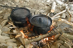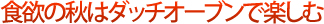 | 収穫の時期である秋は食欲の秋。キャンプ場でも大いに“食”を楽しもう。 そこで、今年の提案は「ダッチオーブン」を使ってのじっくりクッキング。ダッチオーブンはいわば万能鍋。さまざまな料理ができるのが魅力。ぜひチャレンジしよう! |