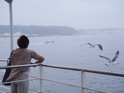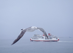 ![]() すれ違うフェリーとその間を飛ぶ海鳥