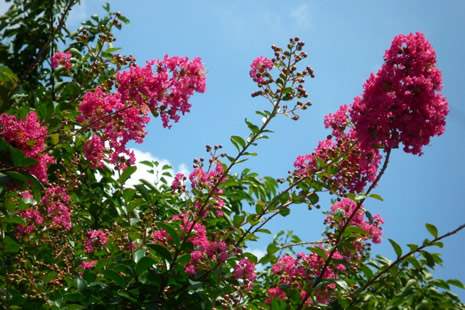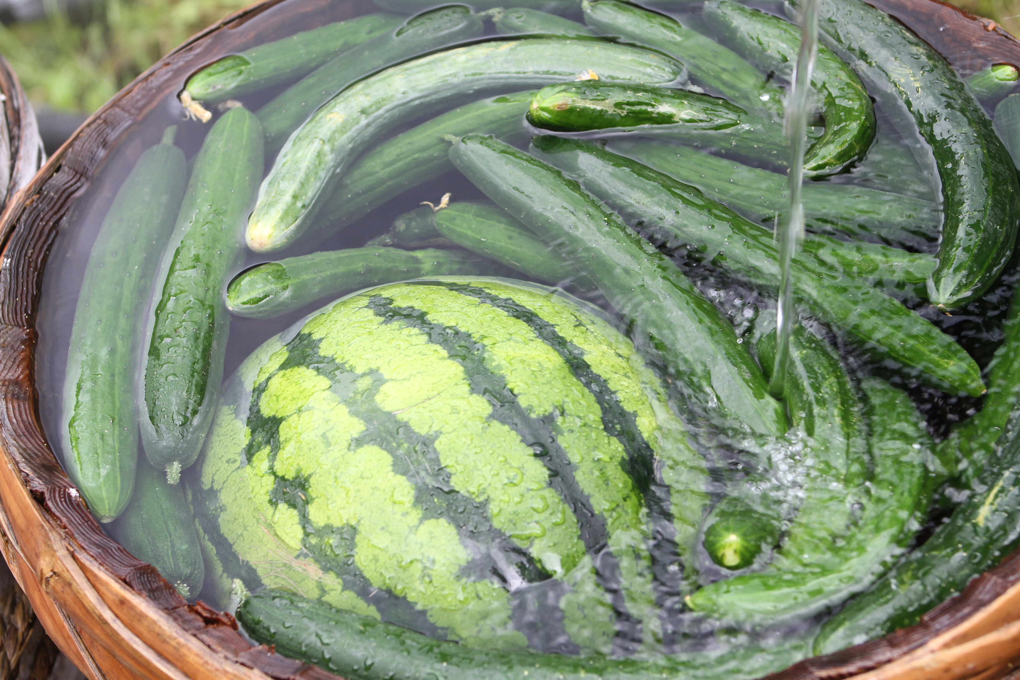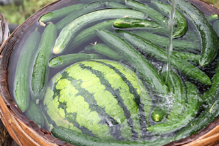 55の神輿が連なって歩く沿道の花壇ではシシトウが実っていました。また、夏でも冷たい中房温泉の清水にはスイカとキュウリが冷えていました。どれも今年の夏の思い出のひとこまです。