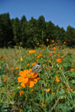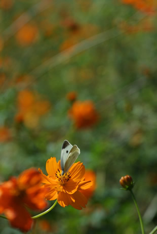 焦点距離10ミリで撮影した(写真I)は、背景があまりボケていませんが、焦点距離110ミリで撮影した(写真J)は背景が大きくボケ、花や蜜を吸うチョウが際立って見えます。また、焦点距離が変わって画角が狭くなったため、背景に色々なものが写らなかったことも良い結果に結びつきました。
