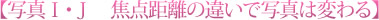 焦点距離が長ければ、その分前後のボケは大きくなります。つまり、同じカメラを使っても、レンズの焦点距離が長ければ前後がボケることになります。写真I・Jは、同じカメラで、焦点距離を10ミリと110ミリにして、花の大きさが同じになるように撮影したものです。