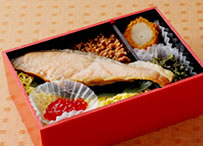 ![]() 850円 [北陸道・黒崎PA上下線 土・日・祝のみ販売] 鮭を余すところなく調理して食べる村上の塩引き鮭をドーンと乗せた。ほかにも生筋子、コロッケ、青菜の胡麻和えなどが入る。 |