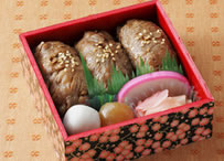 ![]() 800円 [東北道・前沢SA上下線 土・日・祝のみ販売] 名産の黒毛和牛を特製だれに漬け込んでから炙り、酢飯と組み合わせて寿司状にしたお弁当。見るだけでよだれが出そう! |