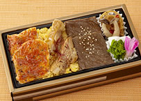 ![]() 1,050円 [関越道・赤城高原SA上下線 土・日・祝のみ販売] 上州牛と県産鶏、シイタケがご飯の上にたっぷりと。尾瀬のまいたけ弁当が人気の「井上食堂」とのコラボレーション弁当だ。 |
