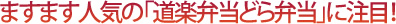 | 以前にこのコーナーで紹介した「道楽弁当どら弁当」がますます人気! ドライブ(道)とともに、お手軽に楽しめるのがコンセプトのこのお弁当、人気の秘密は地域密着とお手頃値段です。 |